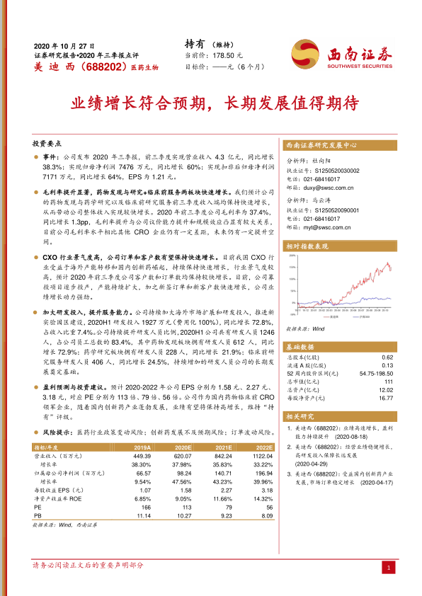 本报告对美迪西2020年三季报进行了全面分析,公司业绩增长符合预期,毛利率提升显著,CXO行业景气度高,公司订单和客户数有望保持快速增长,公司持续加大研发投入,提升服务能力,长期发展值得期待。维持“持有”评级。