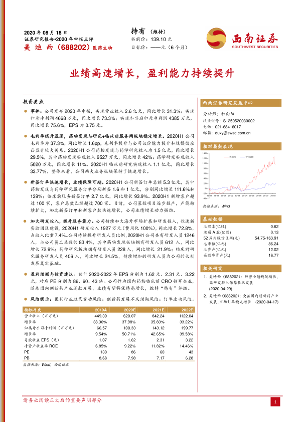 美迪西2020年中报显示公司业绩高速增长,盈利能力持续提升。药物发现与研究、临床前服务两大业务板块均保持稳定增长,新签订单大幅增加,为未来业绩提供保障。公司持续加大研发投入,提升研发人员比例,为长期发展奠定基础。维持“持有”评级,但需关注医药行业政策变动、创新药发展不及预期以及订单波动等风险。