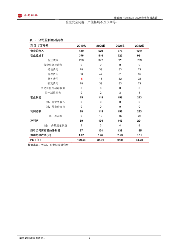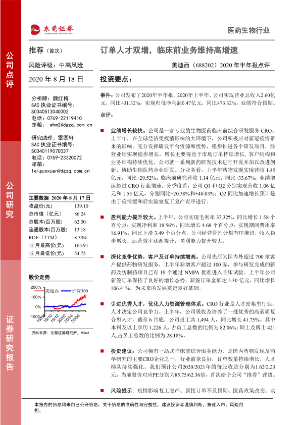 美迪西2020年上半年业绩表现强劲,营收和利润均实现显著增长。公司在药物发现和临床前研究领域表现突出,盈利能力持续提升。新签订单大幅增长,人才队伍不断壮大,为公司未来发展奠定坚实基础。首次给予“推荐”评级,但需关注疫情、政策、安全等风险因素。