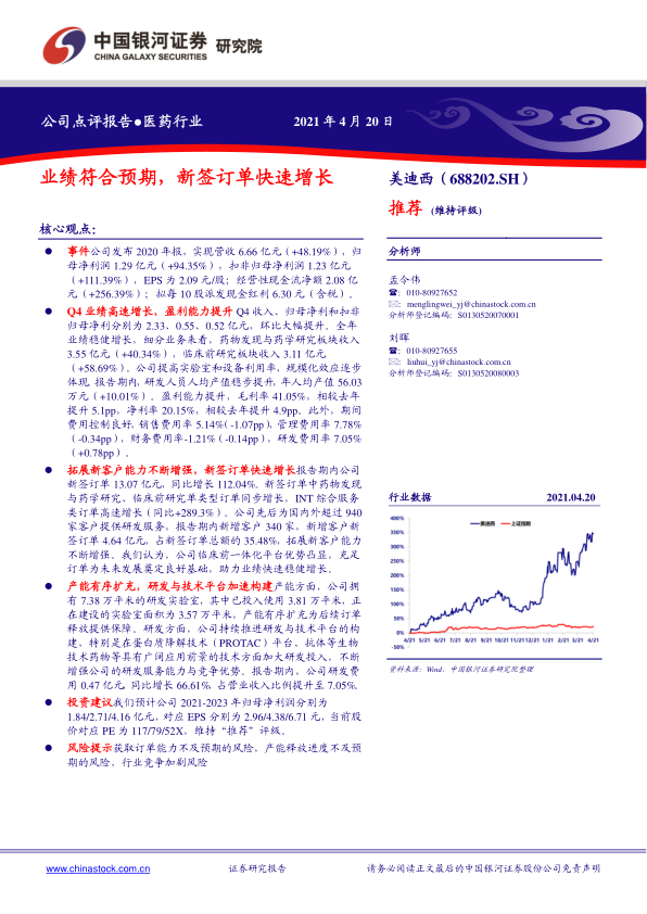 美迪西2020年业绩符合预期,营收和净利润均实现显著增长。公司通过提高实验室和设备利用率,以及研发人员人均产值的提升,实现了盈利能力的提升。