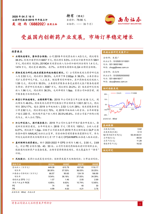 预计2020-2022年EPS分别为1.46元、2.00元、2.69元,对应PE分别为55、40、30倍。鉴于公司作为国内药物临床前评价领军企业,受益于国内创新药产业发展,业绩有望保持高增长,首次覆盖给予“持有”评级。