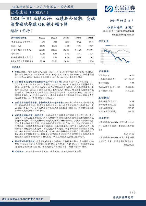 本报告对欧普康视2024年H1业绩进行了全面分析,指出公司业绩符合预期,但OK镜业务受到高端消费疲软的影响。公司在各区域销售均有增长,并积极拓展终端合作。同时,公司在研管线储备丰富,为未来发展提供动力。尽管面临宏观环境带来的挑战,东吴证券仍维持对欧普康视的“增持”评级,但同时也提示了相关风险。
