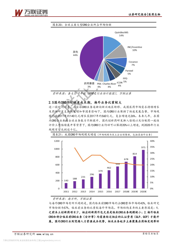 中国CRO行业受益于全球业务转移、国内医药市场需求增长及研发支出快速增加,保持了高速发展态势。市场规模从2011年的140亿元增长至2017年的约560亿元,复合增速达26%,预计到2020年有望达到近千亿。与海外市场不同,国内临床前CRO市场约占CRO整体市场的43%,高于海外,这主要源于本土创新药项目较少以及早期药物发现等环节的人力成本优势。