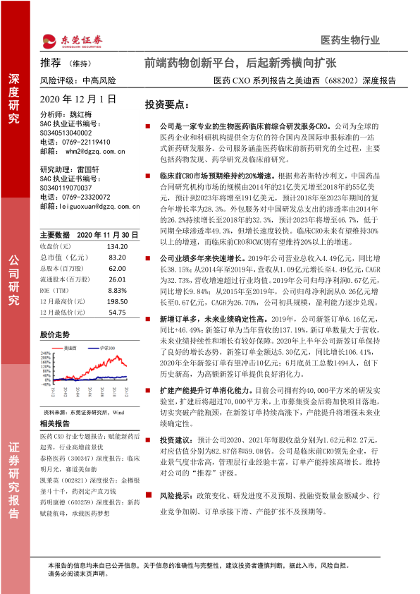 投资建议: 预计公司2020、 2021年每股收益分别为1.62元和2.27元,对应估值分别为82.87倍和59.08倍。公司是临床前CRO领先企业,行业景气度非常高,管理层行业经验丰富,订单产能持续高增长。维持对公司的“推荐”评级。
