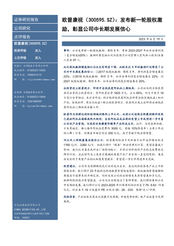 投资建议:公司作为深耕眼视光行业的龙头企业,在近视防控各类产品上不断推陈出新,我们预计23年起视光终端数量有望快速增加,股权激励有望缓解短期集采可能带来的不确定性,同时未来公司的业绩增长来源有望更加多元化,抵御风险的能力有望提高。公司过往业绩通过了各种考验,我们持续看好公司中长期的发展。我们预计公司2023-2025年归母净利润分别至7.79、9.63、11.8亿元,对应6月16日收盘价PE分别为35、28、23X,维持“买入”评级。