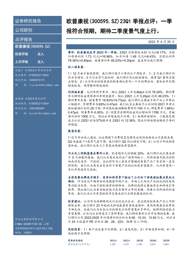 投资建议: 公司作为深耕眼视光行业的龙头企业,在近视防控各类产品上不断推陈出新,我们预计 23 年起视光终端数量有望快速增加,虽然短期集采或带来不确定性,但我们认为未来公司的增长方向有望更加多样化,抵御风险的能力有望更强。公司过往业绩通过了各种考验,我们持续看好公司中长期的发展。我们预计公司 2023-2025 年归母净利润分别为 8.08、 10.33、 13.40 亿元,对应 4月 24 日收盘价 PE 分别为 36、 28、 22X,维持“买入”评级。
