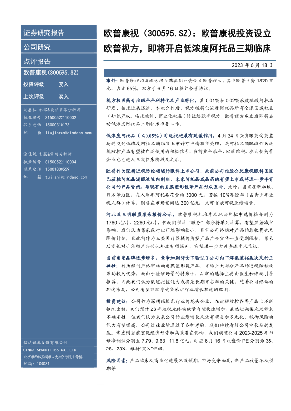 欧普康视拟与视方极医药共同出资设立欧普视方,其中欧普出资1820万元,占比65%,双方已于2023年6月16日签订合资协议。视方极医药专注于眼科科研转化及产业孵化,其0.01%和0.02%浓度硫酸阿托品研发及临床进展迅速。本次合作后,视方极将低浓度阿托品的所有全球区域权益(包括知识产权、临床批件、商业化权益)转让给欧普视方,欧普视方成立后将立即启动低浓度阿托品三期临床准备工作。