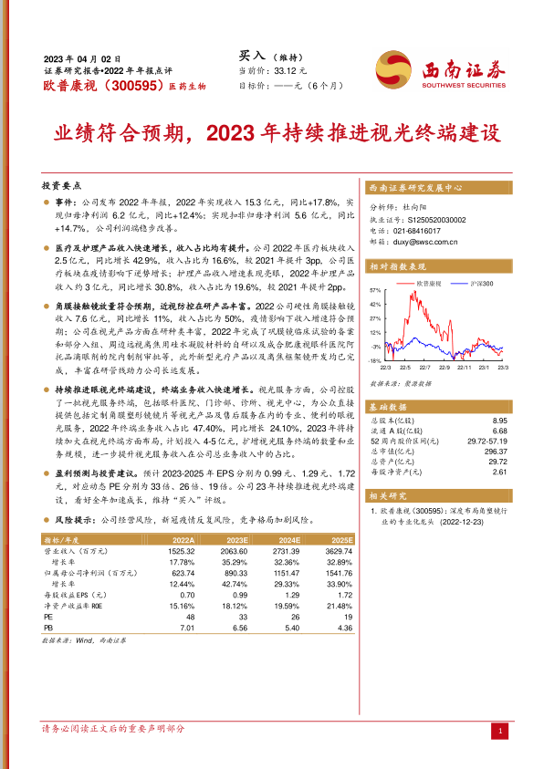 盈利预测与投资建议。预计2023-2025年EPS分别为0.99元、1.29元、1.72元,对应动态PE分别为33倍、26倍、19倍。公司23年持续推进视光终端建设,看好全年加速成长,维持“买入”评级。
