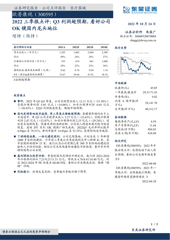 本报告对欧普康视2022年三季报进行了详细分析,指出公司Q3业绩超预期,利润快速恢复,主要受益于疫情影响减弱和公司一体化建设的推进。虽然下调了盈利预测,但维持“增持”评级,看好公司长期成长性。报告还提供了详细的财务预测数据,为投资者提供了参考依据。