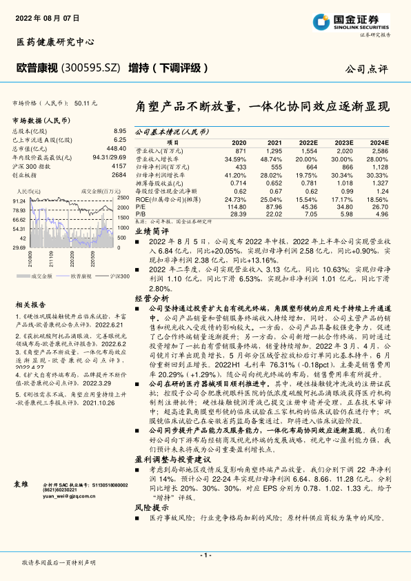 本报告分析了欧普康视2022年中报业绩,指出公司通过扩大视光终端和提升服务能力,实现一体化协同效应。虽然疫情对公司业绩有一定影响,但角膜塑形镜的应用持续上升,在研项目也在顺利推进。考虑到疫情影响,下调了盈利预测,但维持“增持”评级。同时,报告也提示了医疗事故、行业竞争和原材料供应等风险。