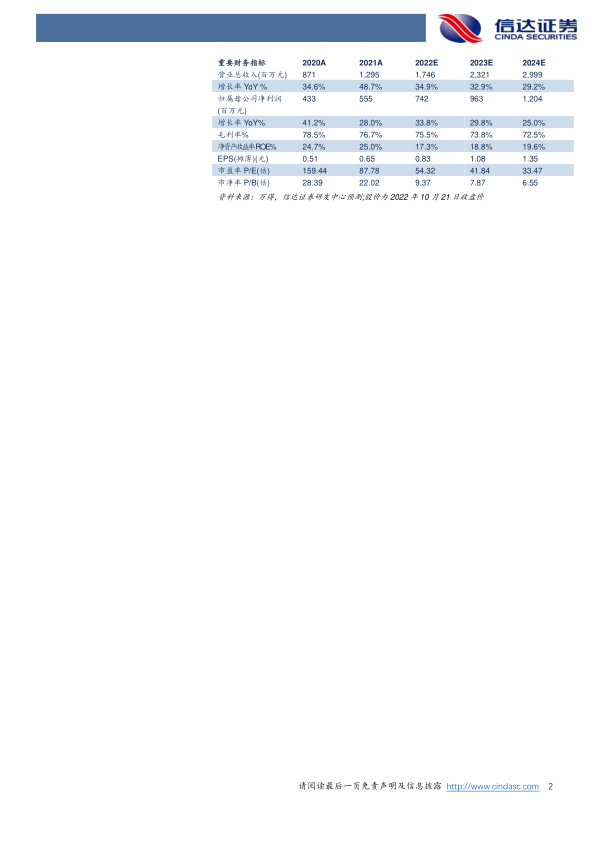 预计公司2022-2024年收入规模分别为17.46/23.21/29.99亿元,同比增长34.9%/32.9%/29.2%,归母净利润为7.42/9.63/12.04亿元,同比增长33.8%/29.8%/25.0%,对应PE为54.32、41.84、33.47倍。维持对公司的“买入”评级。