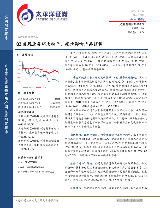 本报告对义翘神州2022年半年度业绩进行了全面分析。公司业绩受到新冠相关产品收入下滑的显著影响,但常规业务表现出较强的韧性。公司持续加大研发投入,并积极拓展新产品线,有望在未来实现增长。维持“增持”评级,但需关注客户拓展、订单量和新产品开发等方面的风险。