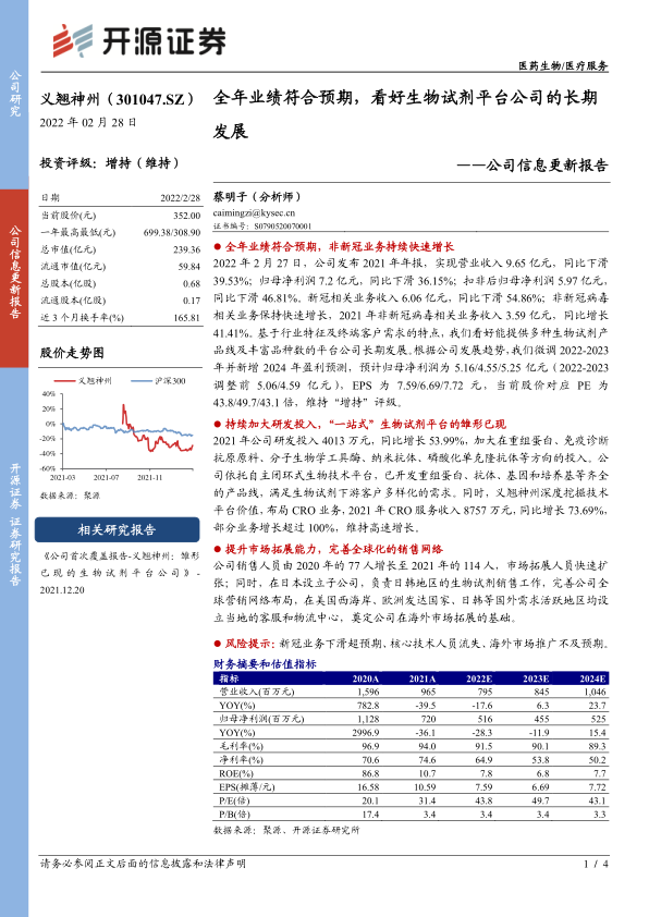 2022年2月27日,公司发布2021年年报,实现营业收入9.65亿元,同比下滑39.53%;归母净利润7.2亿元,同比下滑36.15%;扣非后归母净利润5.97亿元,同比下滑46.81%。新冠相关业务收入6.06亿元,同比下滑54.86%;非新冠病毒相关业务保持快速增长,2021年非新冠病毒相关业务收入3.59亿元,同比增长41.41%。基于行业特征及终端客户需求的特点,我们看好能提供多种生物试剂产品线及丰富品种数的平台公司长期发展。根据公司发展趋势,我们微调2022-2023年并新增2024年盈利预测,预计归母净利润为5.16/4.55/5.25亿元(2022-2023调整前5.06/4.59亿元),EPS为7.59/6.69/7.72元,当前股价对应PE为43.8/49.7/43.1倍,维持“增持”评级。