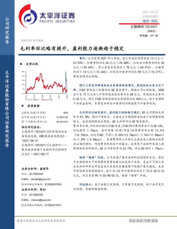 本报告分析了义翘神州(301047)2021年三季报,指出公司整体业绩符合预期。报告强调,尽管新冠相关业务占比下降,但非新冠相关业务保持快速增长,且公司毛利率环比略有提升,盈利能力逐渐趋于稳定。