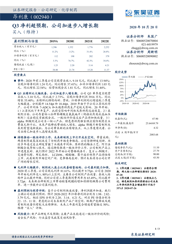 盈利预测与投资评级:鉴于公司制剂快速放量,净利润提升加速,我们上调公司的盈利预测,预计2020-2022年归母净利润分别为1.98、2.82、3.79亿元,相应EPS分别为2.20、3.14、4.21元,对应PE估值分别为22、15、11倍。考虑到公司未来制剂产品广阔空间,短期产能释放及现有制剂放量仍有较大业绩弹性,未来三年盈利复合增速有望接近50%,维持“买入”评级。
