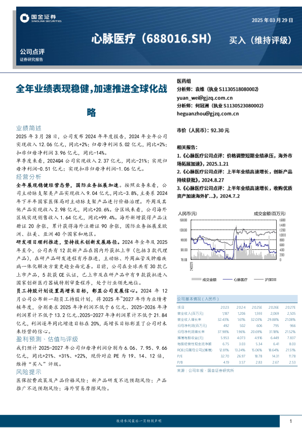 心脉医疗在2024年展现了稳健的经营态势,尤其在国际业务拓展和研发创新方面表现突出。尽管四季度业绩有所下滑,但公司通过积极的海外市场拓展和持续的研发投入,为未来的增长奠定了基础。员工持股计划的高增长目标也彰显了公司对未来发展的信心。维持“买入”评级,但需关注医保政策、研发进度和海外贸易等潜在风险。