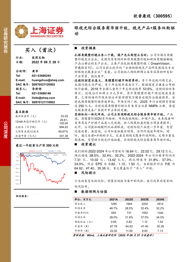 基于对角膜塑形镜、普通角膜接触镜、护理产品、普通框架眼镜、医疗服务及阿托品等核心业务的增长假设,报告预测欧普康视2022-2024年营收分别为16.64亿、22.02亿、29.12亿元,同比增速分别为28.5%、32.4%、32.2%。同期归母净利润分别为7.31亿、10.02亿、13.42亿元,同比增速分别为31.8%、37.0%、34.0%。对应EPS分别为0.82、1.12、1.50元,当前股价对应P/E分别为64.92、47.40、35.38倍。