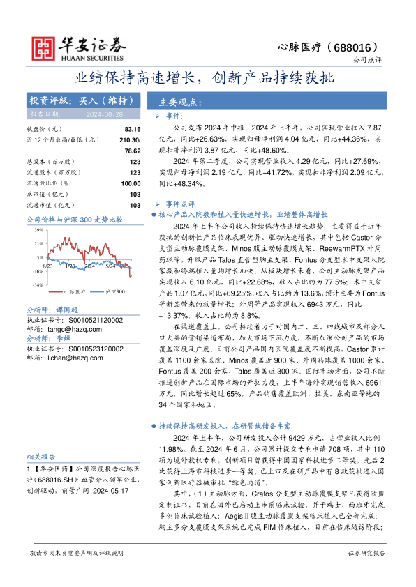 心脉医疗2024年中报显示业绩高速增长,主要得益于创新产品的市场驱动和核心产品入院数量及植入量的快速增长。