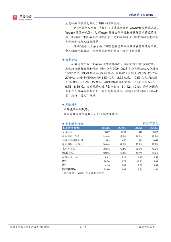 公司近日下调了Castor支架的终端价,预计对出厂价影响有限,我们维持原来的盈利预测,预计公司2024-2026年公司营业收入分别为15.37亿元、19.79亿元和25.25亿元,同比增长分别为29.5%、28.7%、27.6%,归母净利润分别为6.50亿元、8.32亿元、10.59亿元,同比增长32.0%、27.9%、27.3%,2024-2026年对应的EPS分别为5.27、6.75、8.59元,当前股价对应PE分别为16、12、10倍。公司为国内血管介入器械的领军企业,自主创新能力强,后续多款在研项目梯队丰富,维持“买入”评级。