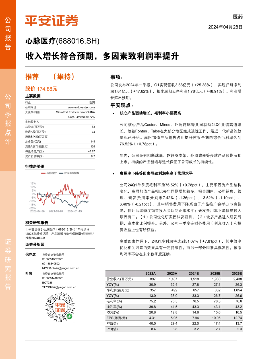 心脉医疗2024年一季报显示,公司营收和利润均实现显著增长,超出预期。核心产品驱动增长,高附加值产品占比提升,费用率有效控制是利润增长的主要原因。公司持续进行产品迭代和市场拓展,未来增长潜力可期。但同时也需关注集采降价、产品上市、海外市场等风险因素。平安证券维持对公司“推荐”评级,并给出了未来三年的盈利预测。