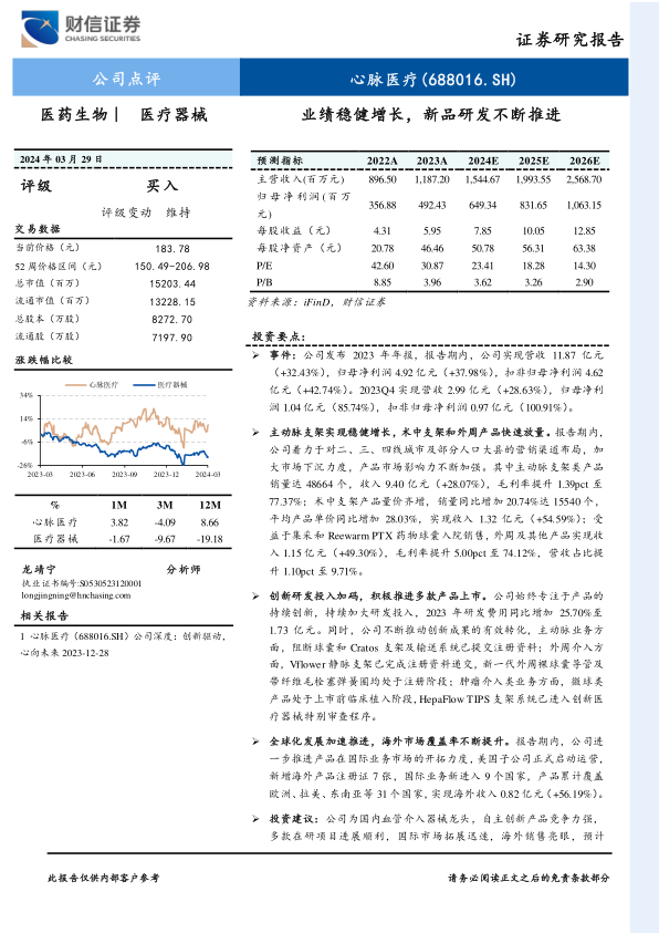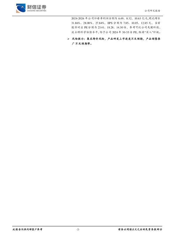 投资建议:公司为国内血管介入器械龙头,自主创新产品竞争力强,多款在研项目进展顺利,国际市场拓展迅速,海外销售亮眼,预计2024-2026年公司归母净利润分别为6.49、8.32、10.63亿元,同比增长31.86%、28.08%、27.84%,EPS分别为7.85、10.05、12.85元,当前股价对应PE分别为23.41、18.28、14.30倍,参考可比公司先健科技、波士顿科学估值水平,给予公司2024年30-35倍PE,维持“买入”评级。