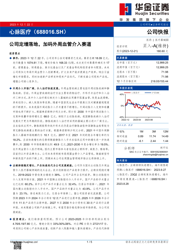 本报告分析了心脉医疗定增落地事件,以及其在外周血管介入领域的市场前景和竞争优势。公司通过定增募资,将进一步加强在外周血管介入领域的布局,有望受益于市场快速增长。公司业绩持续稳定增长,产品快速迭代,维持“买入-A”评级。但同时也提示了产品销售、市场竞争和募投项目等风险。
