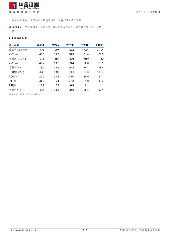投资建议:我们维持盈利预测,预计公司2023-2025年归母净利润分别为4.76/6.19/7.80亿元,增速分别为33%/30%/26%,对应PE分别为27/21/17倍。考虑到公司核心产品快速放量,创新产品入院数和植入量快速增加,产品迭代持续赋能公司发展,推动公司业绩稳定增长,维持“买入-A”建议。