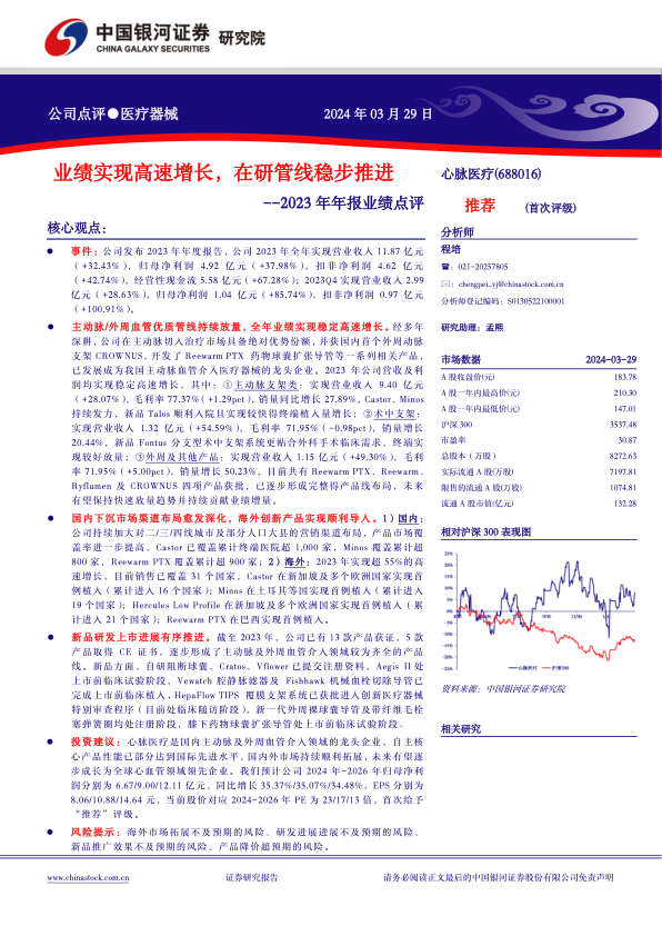 投资建议:心脉医疗是国内主动脉及外周血管介入领域的龙头企业,自主核心产品性能已部分达到国际先进水平,国内外市场持续顺利拓展,未来有望逐步成长为全球心血管领域领先企业。我们预计公司2024年-2026年归母净利润分别为6.67/9.00/12.11亿元,同比增长35.37%/35.07%/34.48%,EPS分别为8.06/10.88/14.64元,当前股价对应2024-2026年PE为23/17/13倍,首次给予“推荐”评级。