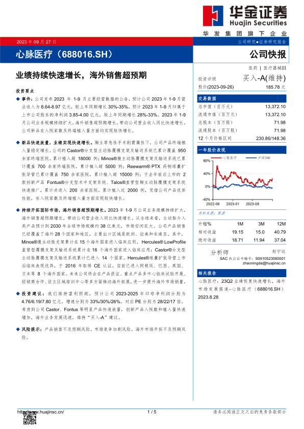 事件:公司发布2023年1-9月主要经营数据的公告,预计公司2023年1-9月营业收入为8.64-8.97亿元,较上年同期增长30%-35%。预计2023年1-9月归属于上市公司股东的净利润3.85-4.00亿元,较上年同期增长28%-33%。2023年1-9月公司业务规模持续扩大,海外销售超预期增长,带动公司营业收入同比快速增长。公司新品在入院家数及终端植入量方面均实现较快增长。