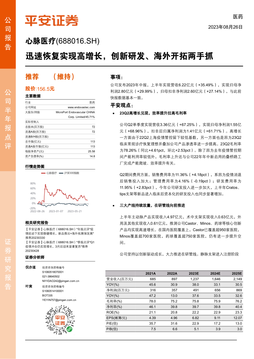 心脉医疗2023年中报显示,公司业绩实现快速恢复和高增长,主要得益于国内疫情影响消退和公司产品渗透率的提高。公司通过持续的创新研发和积极的海外市场拓展,不断提升市场竞争力,为未来的增长奠定基础。平安证券维持对公司的“推荐”评级,并根据医疗机构常规诊疗恢复情况和公司毛利率改善速度,调整了2023-2025年的盈利预测。