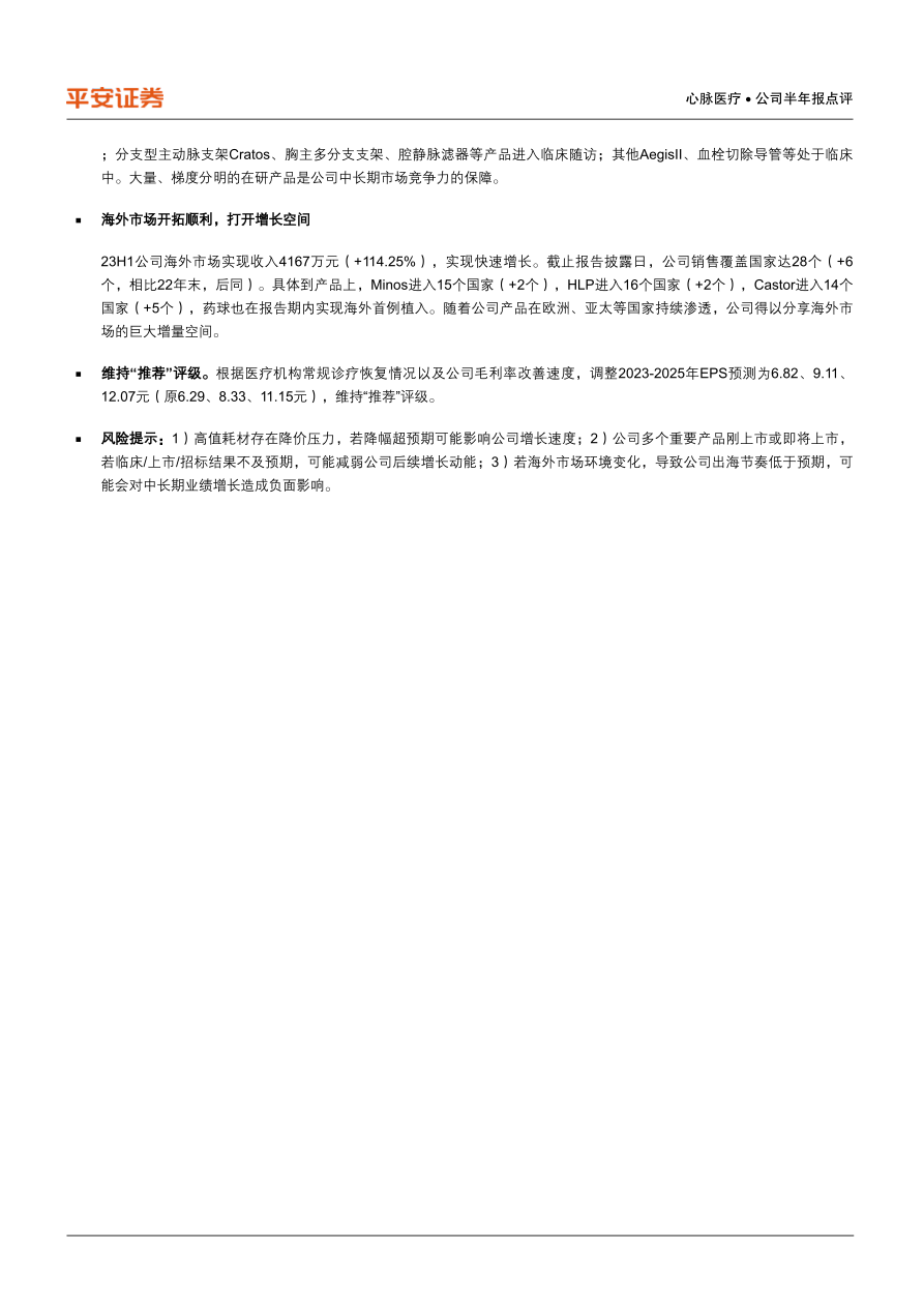 风险提示:1)高值耗材存在降价压力,若降幅超预期可能影响公司增长速度;2)公司多个重要产品刚上市或即将上市,若临床/上市/招标结果不及预期,可能减弱公司后续增长动能;3)若海外市场环境变化,导致公司出海节奏低于预期,可能会对中长期业绩增长造成负面影响。