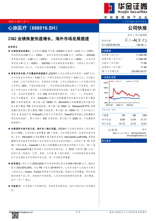 华金证券首次覆盖心脉医疗,给予“买入”评级,主要基于公司在主动脉及外周介入领域的领先地位、明星产品的快速放量、市场覆盖的持续扩大以及海外市场的加速拓展。预计公司未来业绩将保持快速发展。