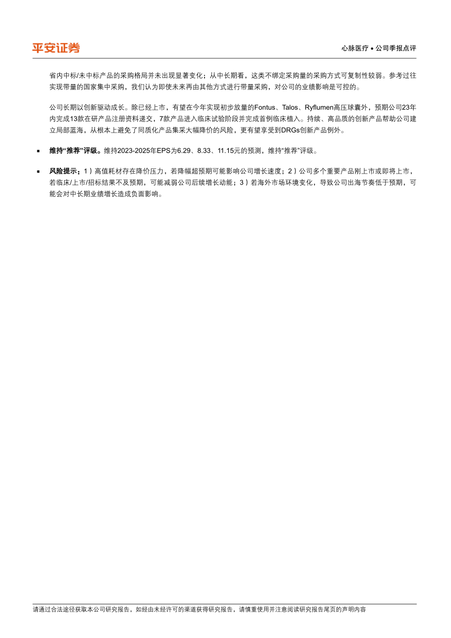 风险提示:1)高值耗材存在降价压力,若降幅超预期可能影响公司增长速度;2)公司多个重要产品刚上市或即将上市,若临床/上市/招标结果不及预期,可能减弱公司后续增长动能;3)若海外市场环境变化,导致公司出海节奏低于预期,可能会对中长期业绩增长造成负面影响。