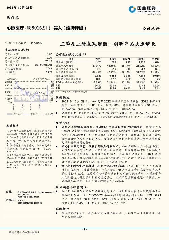 心脉医疗在2022年前三季度展现出卓越的业绩增长,特别是第三季度表现亮眼,主要得益于其创新产品在主动脉及外周血管介入市场的持续领先地位和快速增长。公司通过丰富的研发管线布局,覆盖多个高潜力医疗领域,并辅以长期股权激励计划,充分彰显了其长期增长潜力和管理层信心。此外,新一期定增预案的推进将进一步扩大产能,加速外周及肿瘤介入产品的战略布局,为公司未来发展注入强大动力。财务预测显示,公司营业收入和归母净利润将持续保持高速增长,盈利能力和资产管理效率不断提升,财务结构稳健。尽管面临医保控费、研发及推广不达预期以及海外贸易摩擦等风险,但鉴于公司强大的创新能力、清晰的战略规划和健康的财务状况,分析师维持“买入”评级,认为公司具备显著的长期投资价值。