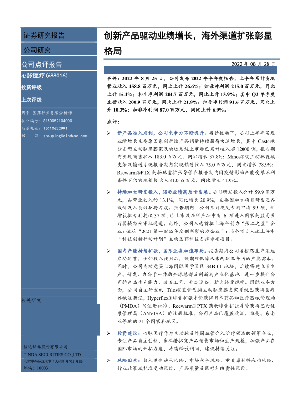 本报告分析了心脉医疗2022年半年度报告,核心观点如下: