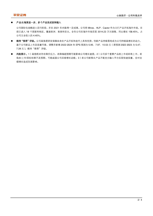 心脉医疗2021年业绩表现亮眼,主要得益于核心产品和外周介入业务的强劲增长。公司持续的研发投入和国际化战略为未来发展奠定了基础。平安证券维持对心脉医疗的“推荐”评级,但同时也提示了高值耗材降价、产品上市以及新产品推广等方面的风险。