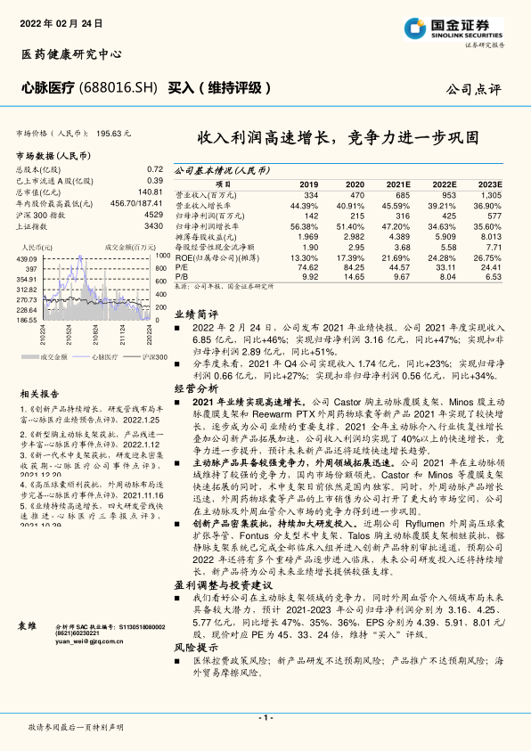心脉医疗在2021年实现了强劲的业绩增长,收入和归母净利润同比增幅均超过40%,主要得益于其创新产品的成功推广和主动脉介入市场的恢复。公司在主动脉领域保持领先地位,并通过外周血管介入产品的快速拓展打开了新的市场空间。持续的研发投入和密集获批的创新产品为公司未来业绩增长提供了坚实基础。尽管存在医保控费、研发及推广不达预期等风险,但鉴于公司强大的核心竞争力和广阔的市场前景,报告维持“买入”评级,并预计未来几年公司将继续保持高速增长。