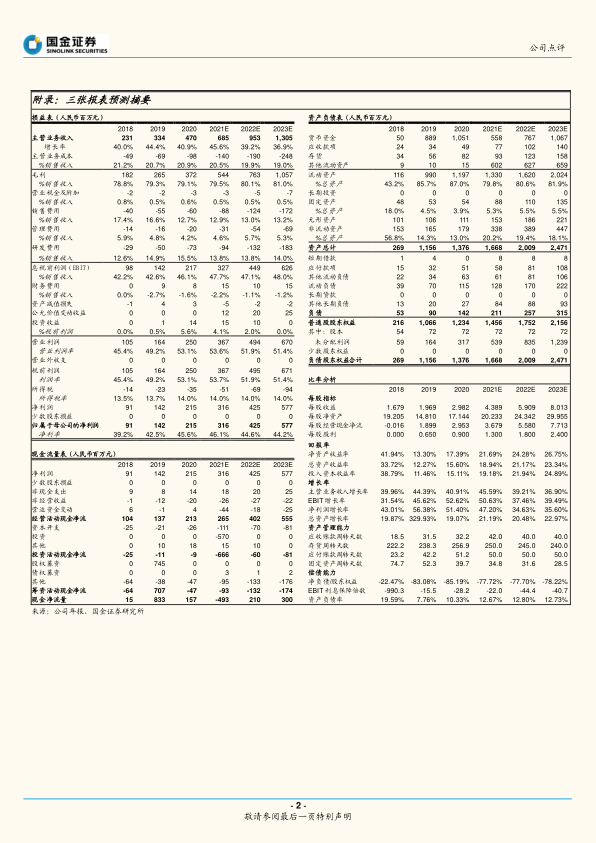 附录提供了公司2018年至2023年(预测)的损益表、资产负债表和现金流量表摘要。数据显示,公司营业收入和归母净利润持续增长,毛利率和净利率保持在较高水平。资产结构稳健,流动资产占比高。经营活动现金流净额持续为正,显示公司经营状况良好。各项比率分析也表明公司盈利能力、成长能力和偿债能力均表现优异。