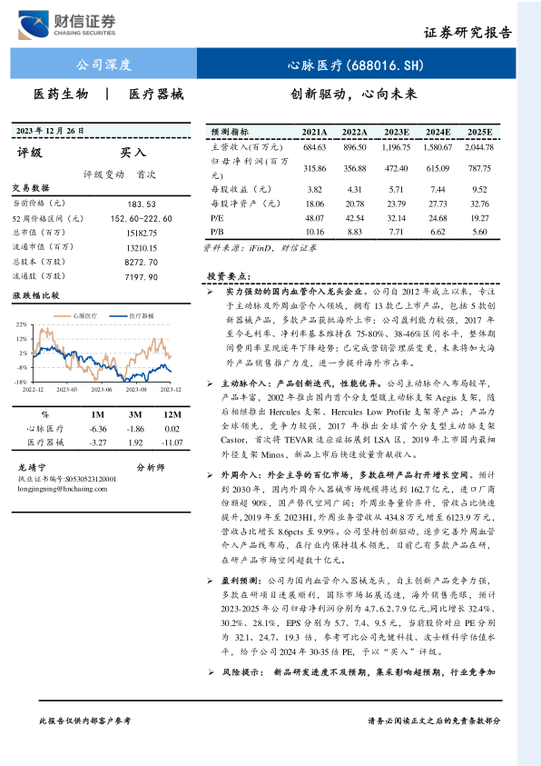 盈利预测:公司为国内血管介入器械龙头,自主创新产品竞争力强,多款在研项目进展顺利,国际市场拓展迅速,海外销售亮眼,预计2023-2025年公司归母净利润分别为4.7、6.2、7.9亿元,同比增长32.4%、30.2%、28.1%,EPS分别为5.7、7.4、9.5元,当前股价对应PE分别为32.1、24.7、19.3倍,参考可比公司先健科技、波士顿科学估值水平,给予公司2024年30-35倍PE,予以“买入”评级。