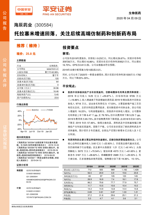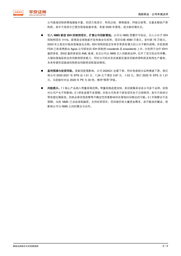 受新冠疫情及部分品种增速下滑影响,平安证券将公司2020-2021年EPS预测分别由1.01元、1.24元下调至0.87元、1.03元,并预计2022年EPS为1.21元。当前股价对应2020年PE为30倍。基于公司在高端仿制药和创新药领域的战略布局,以及长期增长潜力,平安证券维持对海辰药业的“推荐”投资评级。