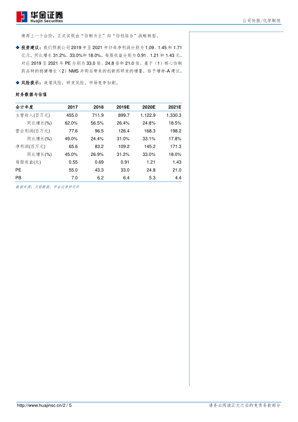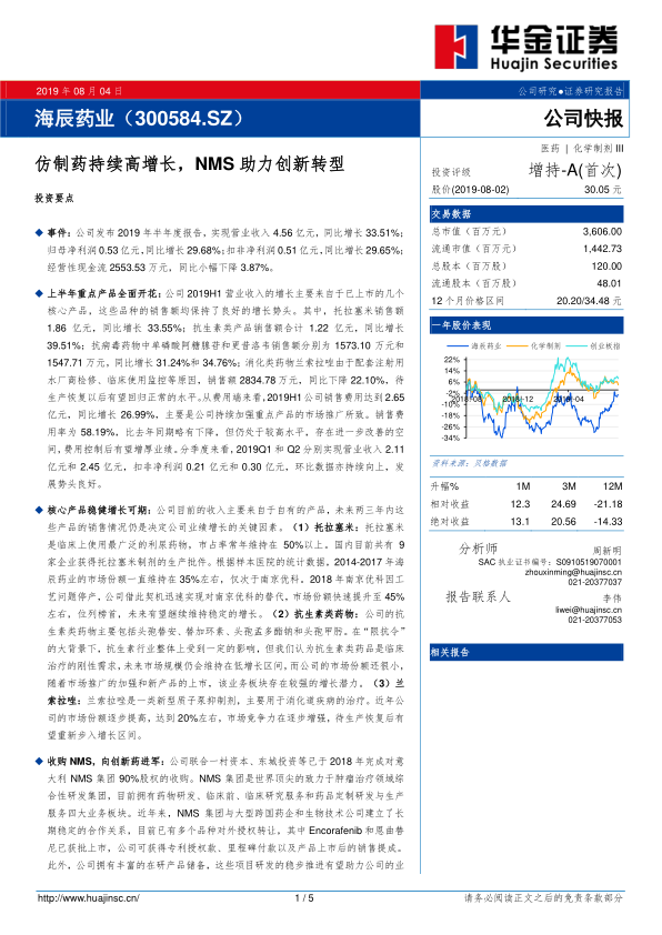 海辰药业在2019年上半年实现了显著的业绩增长,营业收入和归母净利润分别同比增长33.51%和29.68%,主要得益于托拉塞米、抗生素类产品等核心仿制药的强劲销售表现。特别是托拉塞米,在市场格局变化后,公司市场份额已跃居首位,显示出强大的市场竞争力。同时,公司通过收购意大利NMS集团,成功布局创新药领域,实现了从“仿制为主”向“仿创结合”的战略转型,为未来业绩增长和长期发展注入了新的动力。分析师预计公司未来三年净利润将持续增长,并给予“增持-A”的投资评级,但需关注政策、研发及市场竞争等潜在风险。