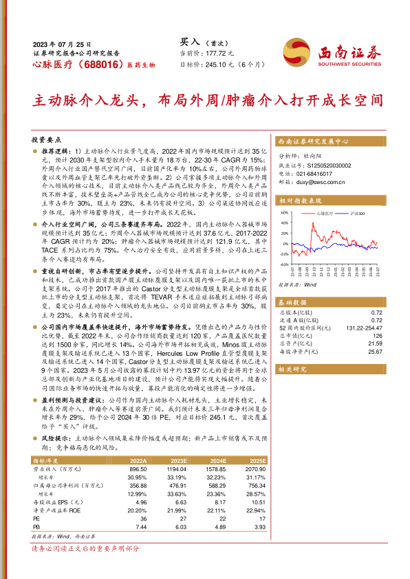 盈利预测与投资建议:公司作为国内主动脉介入耗材龙头,主业增长稳定,未来在外周介入、肿瘤介入等赛道前景广阔。我们预计未来三年归母净利润复合增长率为29%,给予公司2024年30倍PE,对应目标价245.1元,首次覆盖给予“买入”评级。
