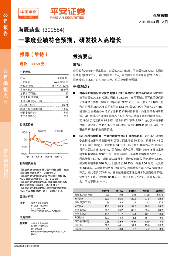 海辰药业2019年一季度业绩符合预期,收入和利润均实现同比增长。平安证券维持对公司“推荐”评级,主要基于以下几点: