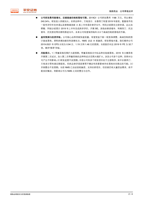 尽管面临带量采购、研发进度和并购整合等风险,但平安证券仍维持对海辰药业的“推荐”评级,看好公司未来的发展前景。