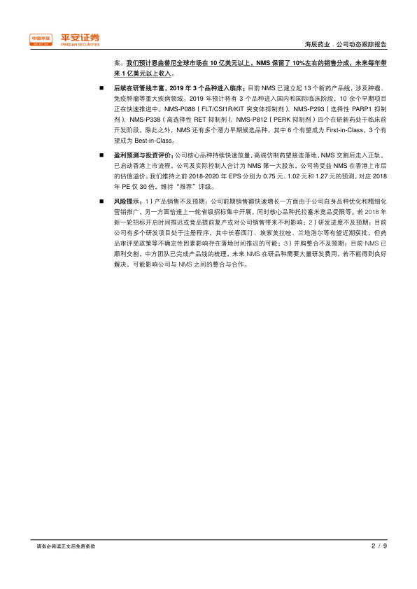 本报告分析了海辰药业投资的 NMS 集团的研发管线和上市前景。NMS 研发实力雄厚,拥有多个潜力巨大的对外授权品种和丰富的在研管线。NMS 启动港股上市流程,有望显著提升海辰药业的估值。维持海辰药业“推荐”评级。