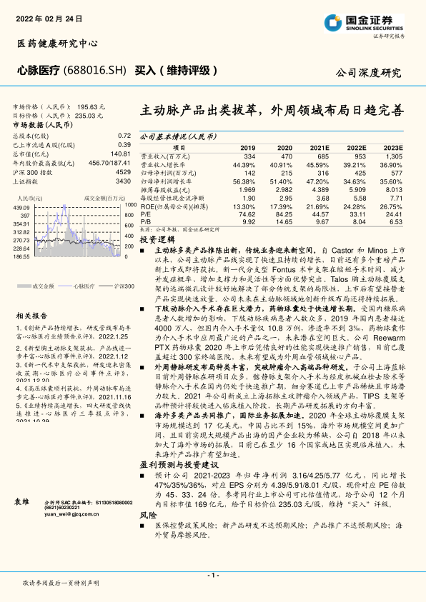 心脉医疗通过子公司上海鸿脉(成立于2020年4月,100%控股)积极布局外周动脉介入器械市场,核心产品为Reewarm PTX药物球囊扩张导管。公司聘任郭澜涛先生(拥有20多年血管介入治疗领域研发及管理经验)担任上海鸿脉总经理,并招募多位海归研发人员,具备强大的创新研发实力。