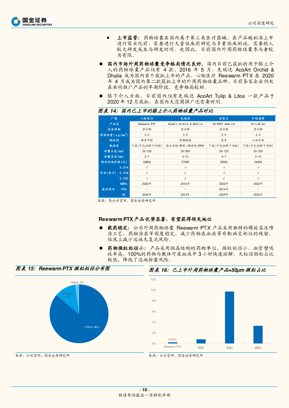 下肢动脉疾病(LEAD)患者众多,主要诱因包括糖尿病,2019年国内糖尿病足患者约740万人,预计2030年增至970万人;下肢动脉疾病患者人数从2019年的3960万人预计增至2030年的4980万人。介入手术是晚期LEAD的主要治疗方式,因并发症少、康复快而受青睐。国内下肢动脉介入手术量从2019年的10.78万例(渗透率不足3‰)预计到2024年将达27.31万例,复合增速20.4%。 药物涂层球囊(DCB)或药物洗脱球囊(DEB)因其抗增殖药物涂层能有效降低血管再狭窄和弹性回缩风险,且无需植入异物,符合“介入无植入”趋势,在外周介入领域应用广泛。DCB在再狭窄和二次治疗干预方面优于普通PTA球囊、裸金属支架和覆膜金属支架。国内下肢药物球囊手术量从2019年的1.22万例(占下肢动脉介入手术量的11.3%)预计到2024年将达10.53万例,复合增速53.9%,占比将达38.6%。国内下肢动脉药物球囊市场规模从2019年的1.42亿元预计到2024年将增至13亿元,复合增速55.1%,2030年有望达29亿元。 药物球囊存在较高的准入壁垒,包括高度精密的涂层制造技术和严格的上市监管(三类医疗器械)。目前国内膝上介入药物球囊仅有4款获批,心脉医疗的Reewarm PTX于2020年4月获批,市场竞争格局良好。 Reewarm PTX产品优势显著: