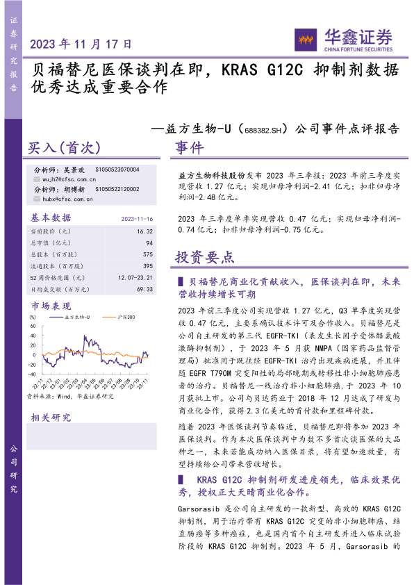 本报告核心观点聚焦于益方生物-U(688382.SH)的贝福替尼和Garsorasib两款核心药物。贝福替尼商业化进展顺利,医保谈判在即,有望加速放量,持续贡献营收。