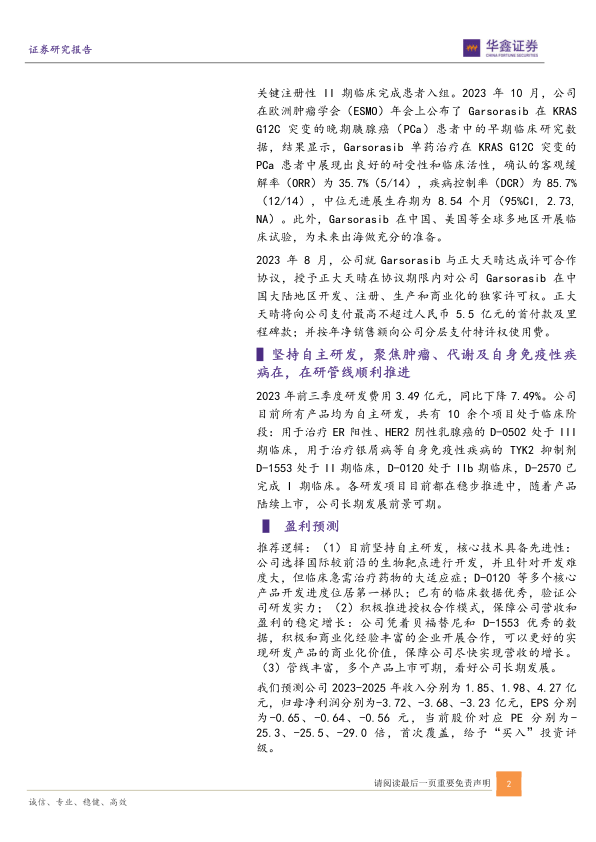 Garsorasib作为国内首个自主研发的KRAS G12C抑制剂,临床数据优秀,并与正大天晴达成商业化合作,为公司带来新的增长点。公司坚持自主研发,聚焦肿瘤、代谢及自身免疫性疾病领域,多个在研管线稳步推进,长期发展前景可期。