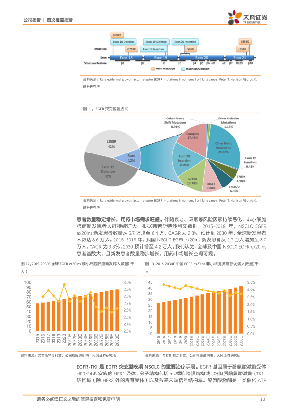 舒沃替尼为高选择性EGFR-TKI,是肺癌领域首个且目前唯一获中美双“突破性疗法认定”的国创新药,首选适应症为EGFR20号外显子插入突变非小细胞肺癌,20ins为非小细胞肺癌EGFR第三大突变类型占比约10%,舒沃替尼ORR59.8%显著优于全球同类产品。目前国内NDA已获优先审评,有望于2023年中上市;海外注册临床加速推进中,有望于2023年底提交美国NDA。我们认为该疾病领域仍存在较大未被满足的治疗需求,舒沃替尼凭借优异疗效和可控安全性,有望成为全球有力竞争者。